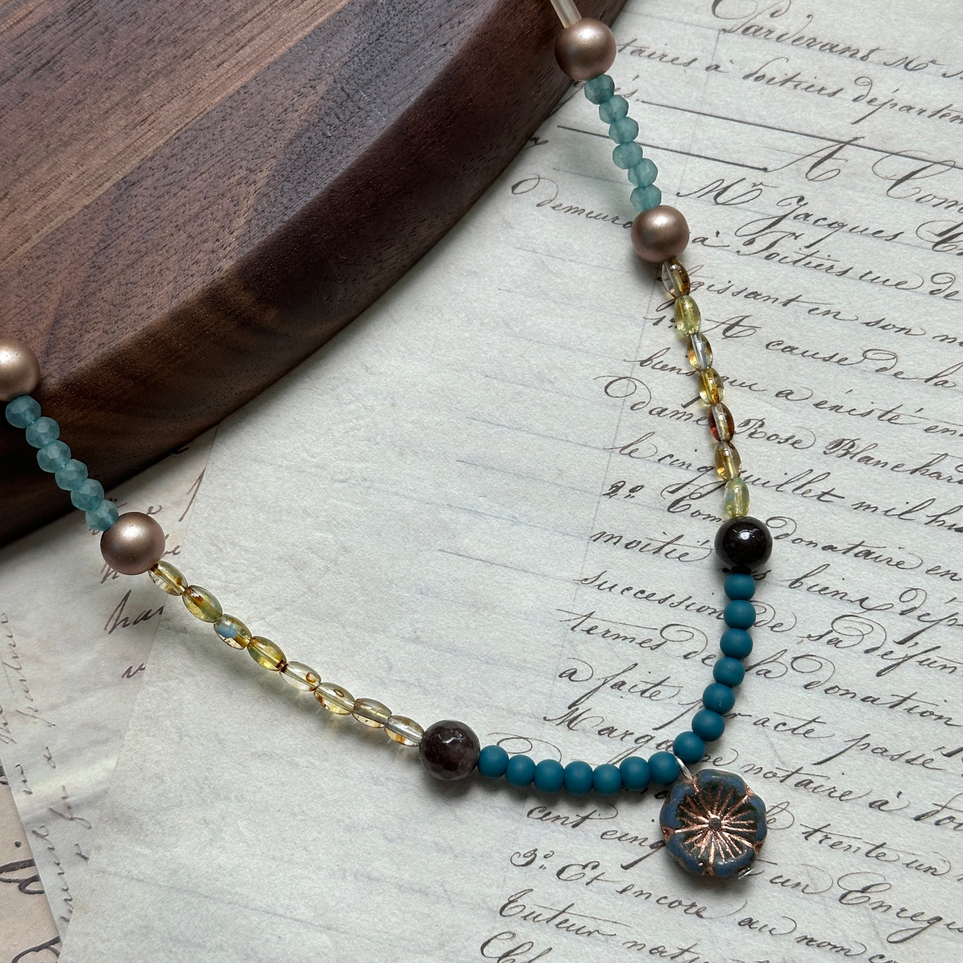 Cuentas de color azul laguna con perlas color champán y detalles dorados, rematadas con un medallón radiante con efecto sol para un ambiente costero brillante.