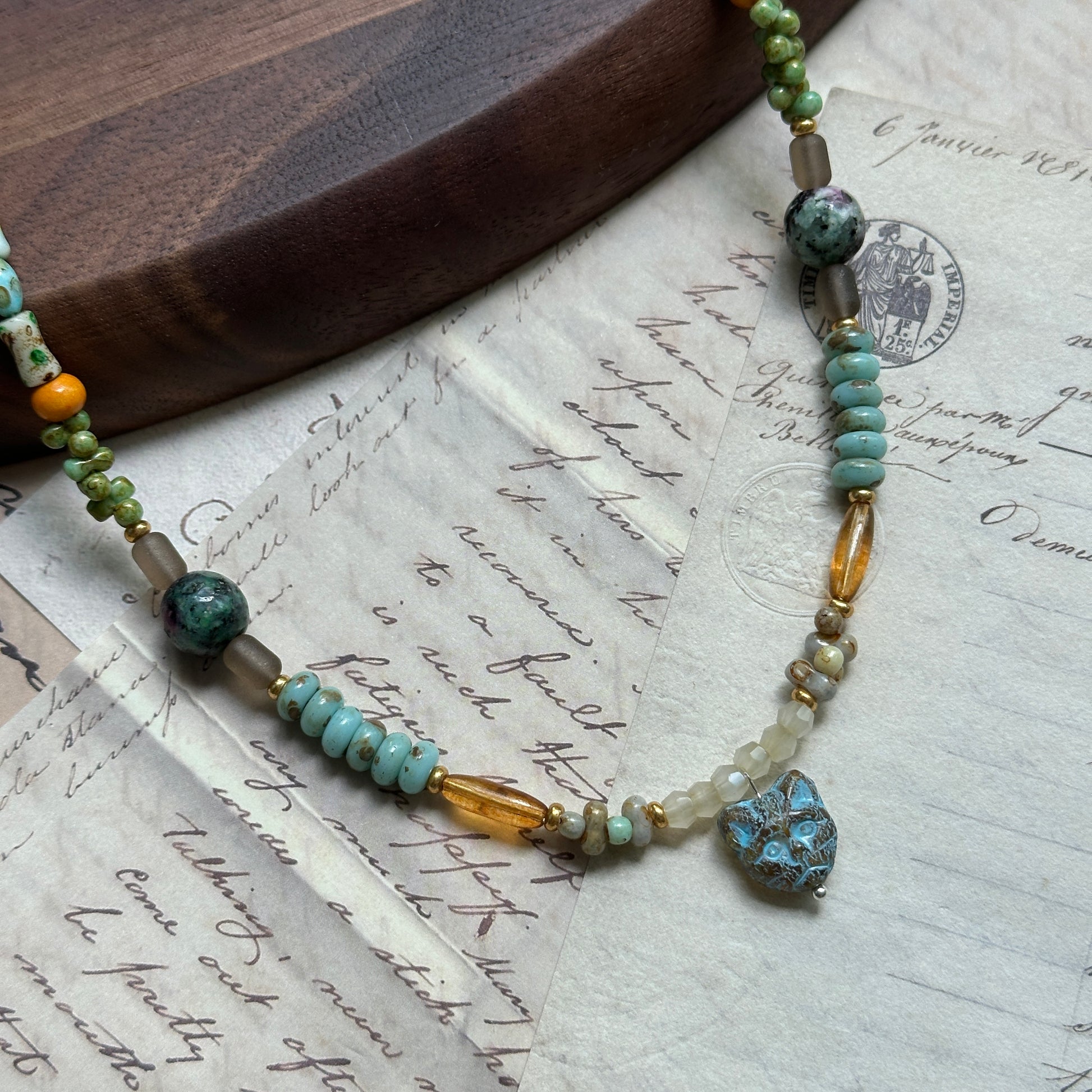 Nota: Las piedras naturales y las cuentas de vidrio pueden reflejar los colores de forma ligeramente diferente según la iluminación y el ángulo, por lo que puede haber ligeras variaciones entre el vídeo y las fotos. Consulta las fotos del producto para ver los colores más precisos. Esto forma parte del encanto único de la joyería artística artesanal: cada pieza revela su propia belleza en diferentes entornos.