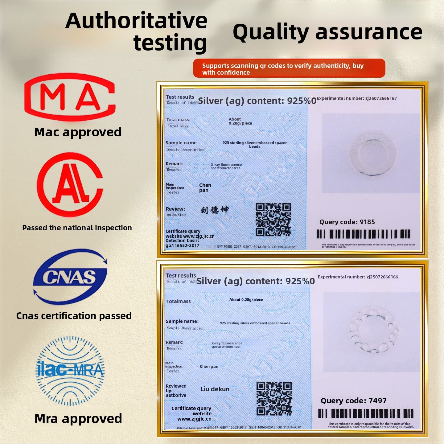 - 925 Silver spacers:multiple textures (sweet ring, braided/rope, scale pattern, twisted hemp) and one largerunning ring(outer Ø ~18 mm, inner Ø ~10 mm, thickness ~4 mm).