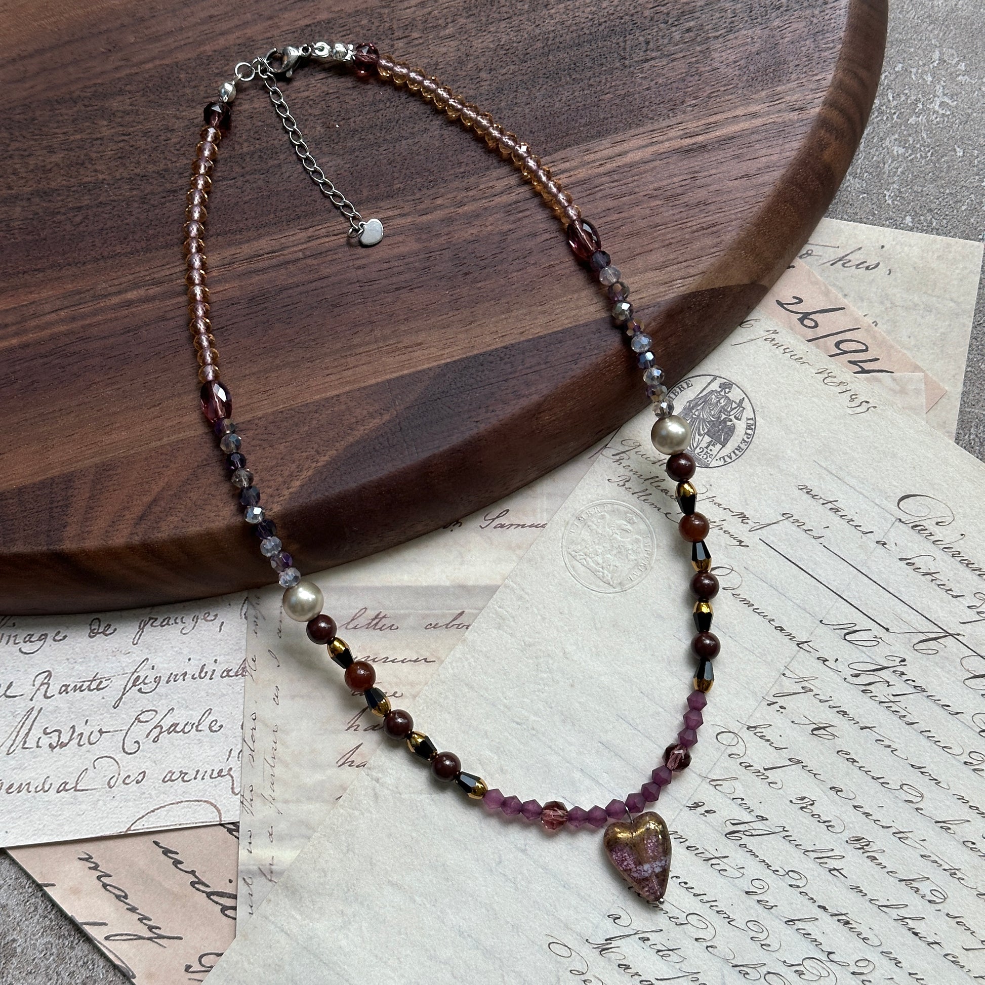 Mixed glass beads in plum/crimson/gold, blush glass heart pendant, pearl accents, faceted crystal beads, stainless/plated findings; hand-strung construction.