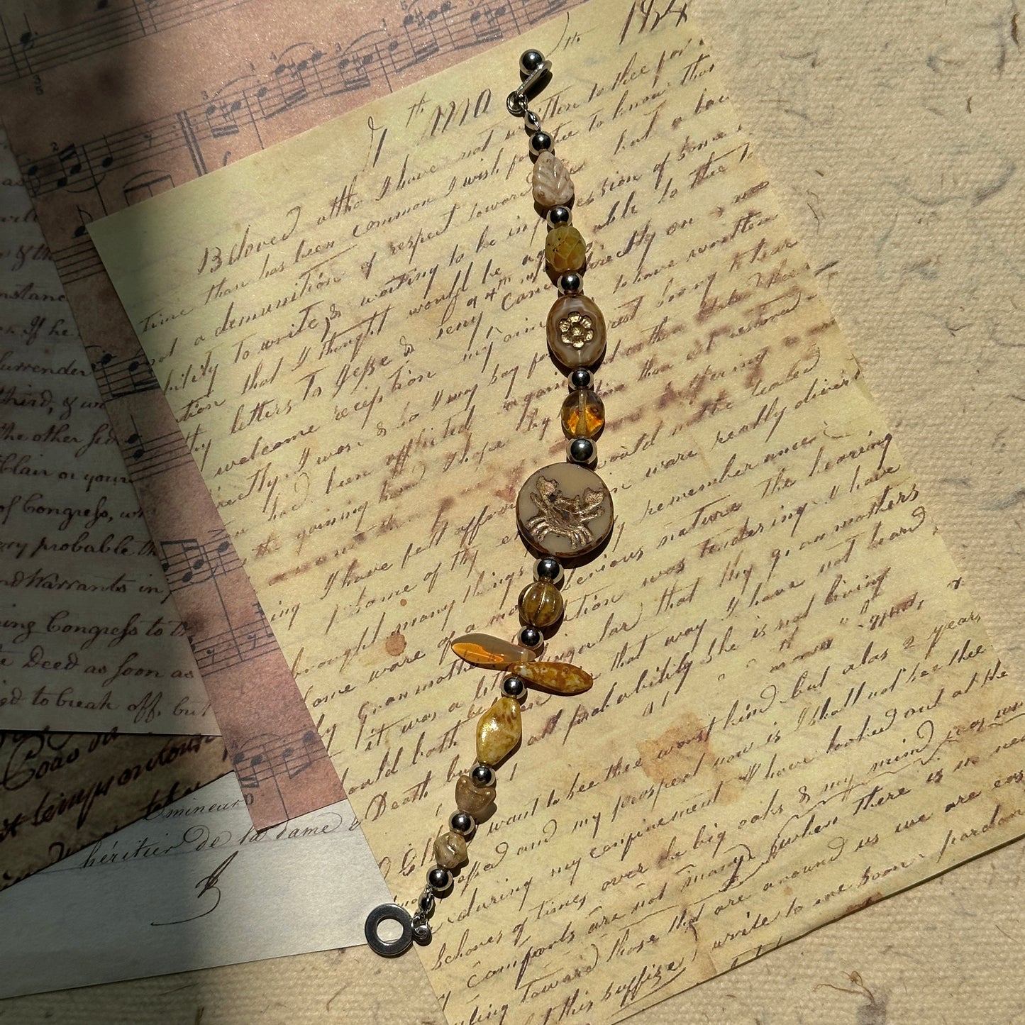 Lampwork glass crab charm; Czech floral/leaf bead; amber and honey-toned glass beads; metallic round spacers; nickel-free clasp; handcrafted stringing.