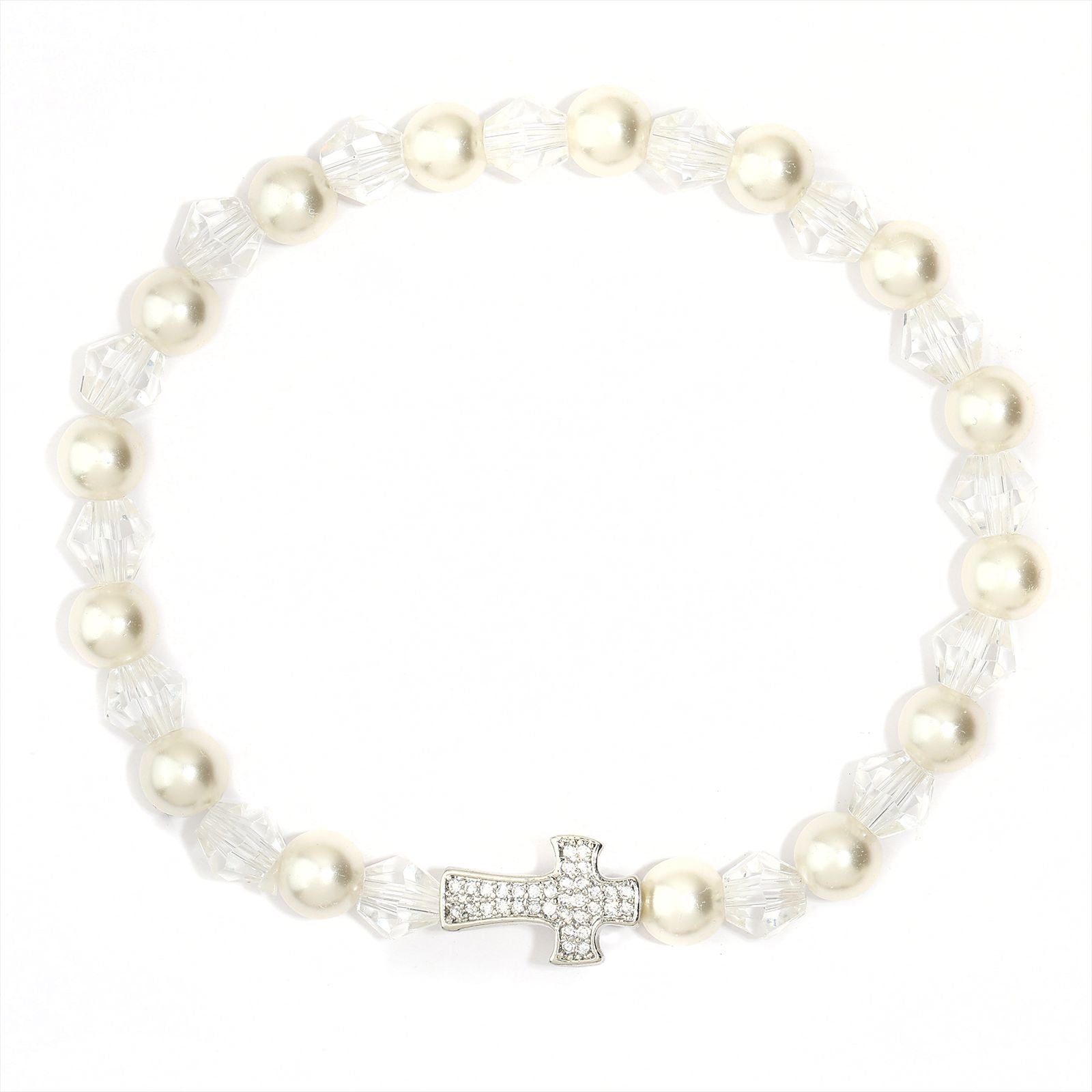Blessed Pearl Cross Charm Bracelet— a delicate keepsake for her First Holy Communion, Baptism, or Confirmation.White pearls pair with faceted crystals and a sparkling cross charm for a timeless, faith-filled look.