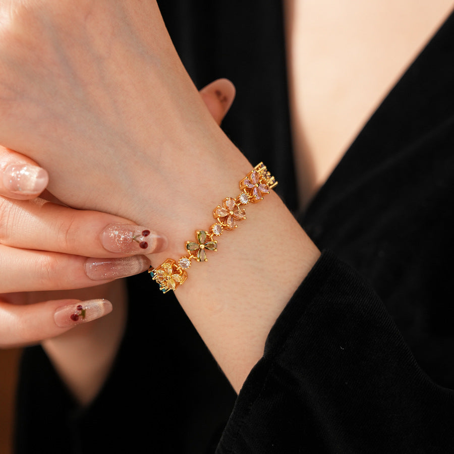 This dazzling bracelet showcases a series of four-leaf clovers crafted from multicolor zircon petals, accented with golden settings for a radiant finish. Each shimmering bloom symbolizes luck, beauty, and celestial elegance.