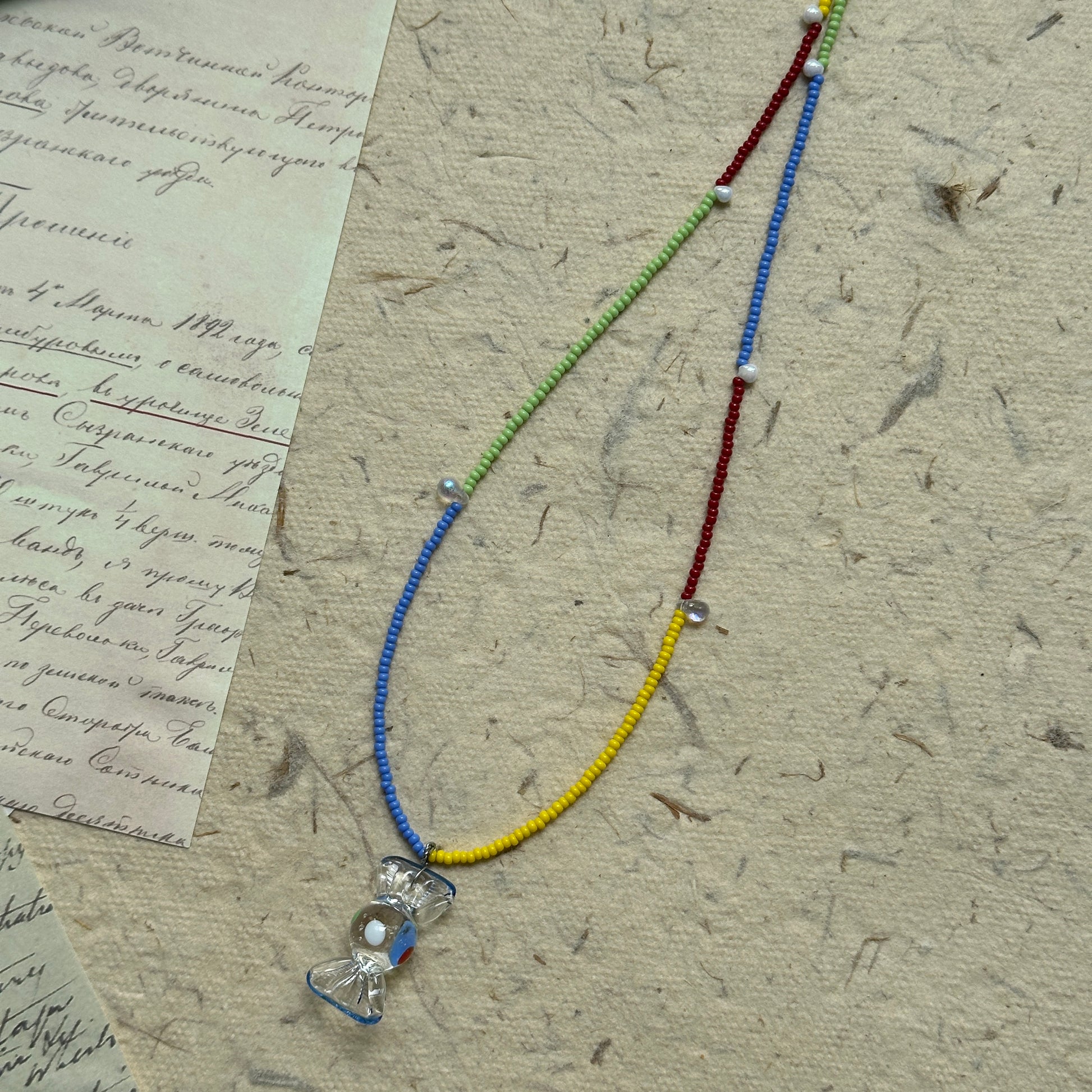 Glass seed beads in red, green, yellow, and blue; small pearl-like accent beads; clear crystal-style glass pendant; nickel-free metal findings; lobster clasp; artisan stringing.