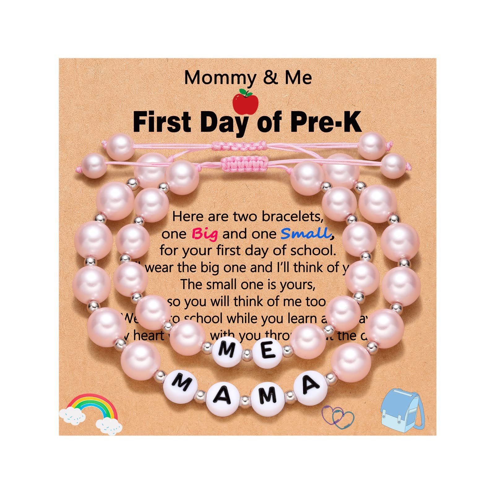 Mommy & Me First-Day Duois a sweet set of two matching beaded bracelets made for that big first day—Pre-K, Kindergarten or the return to school.Wear the big one, give the small one to your little learner, and keep each other close all day long.