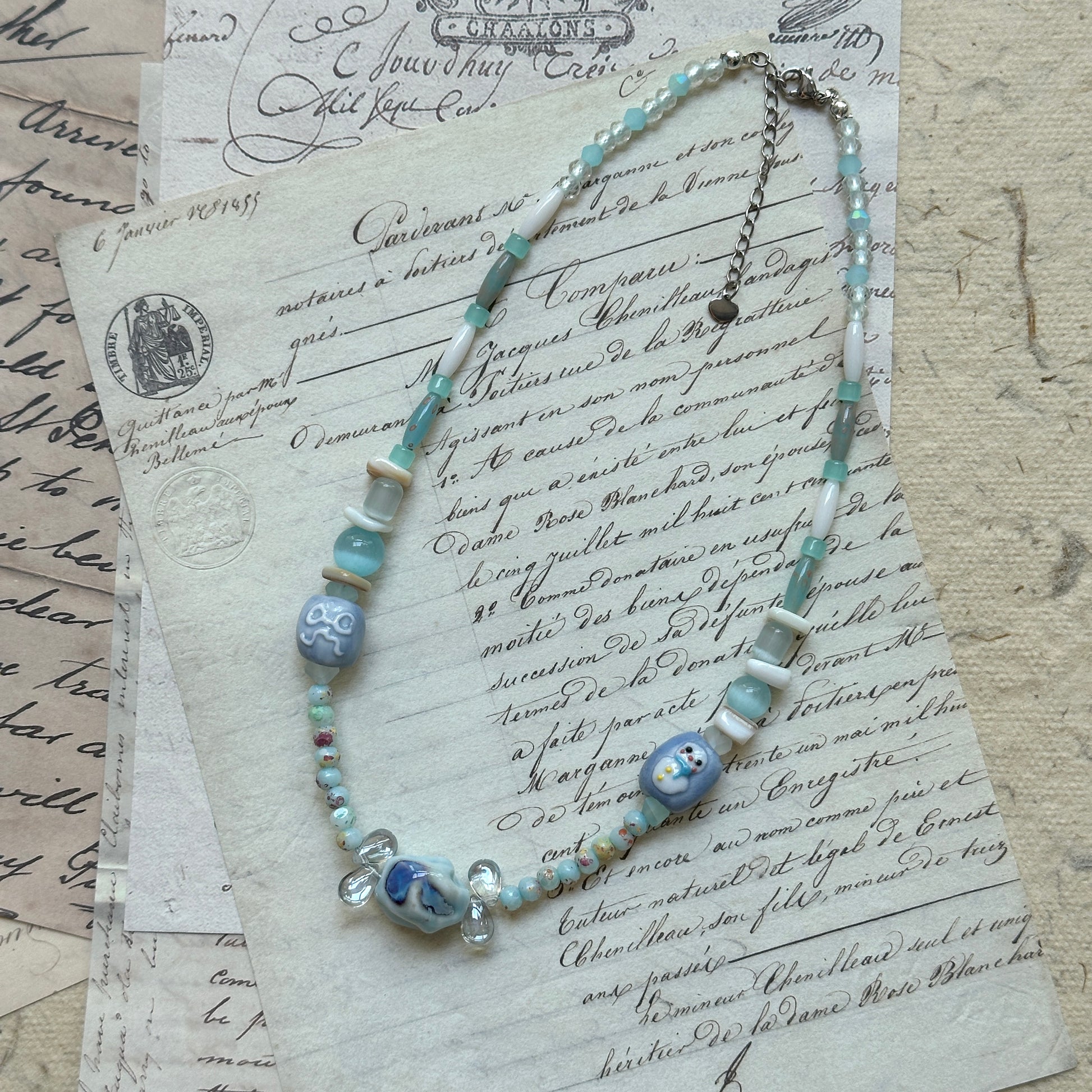 Evoking the calm rhythm of waves and the playful spirit of marine life, the Ocean Whisper Necklace blends whimsical glass charms with a tranquil coastal palette. Each bead feels like a fragment of ocean memory, captured in wearable form.