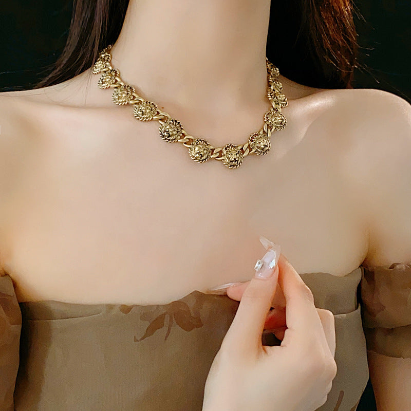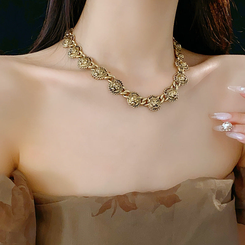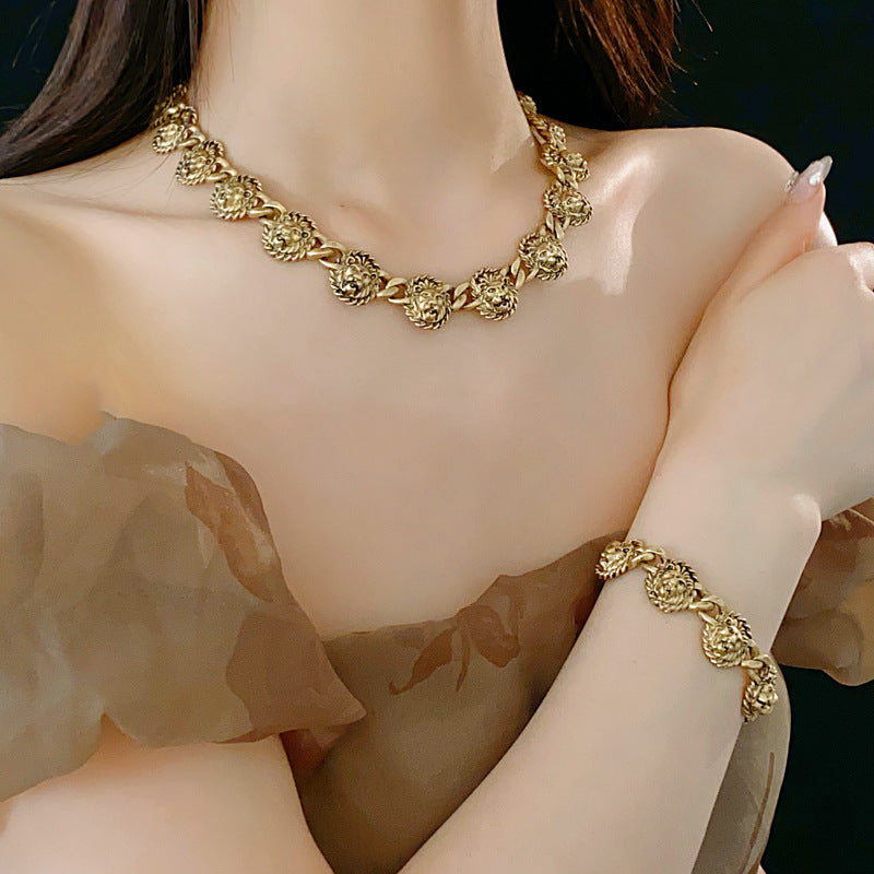 This bold yet refined set showcases intricately sculpted lion medallion links in a warm gold-tone alloy. The vintage-inspired relief texture and solid, polished finish create a commanding light-luxury presence whether the pieces are worn together or separately.