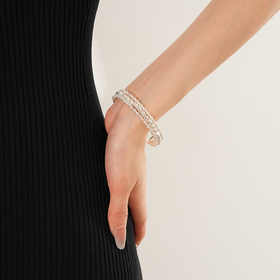 Inspired by couture trims and night-sky stardust, densely layered micro “loops” create a soft, knitted effect along a sleek open band for a refined, light-catching finish.
