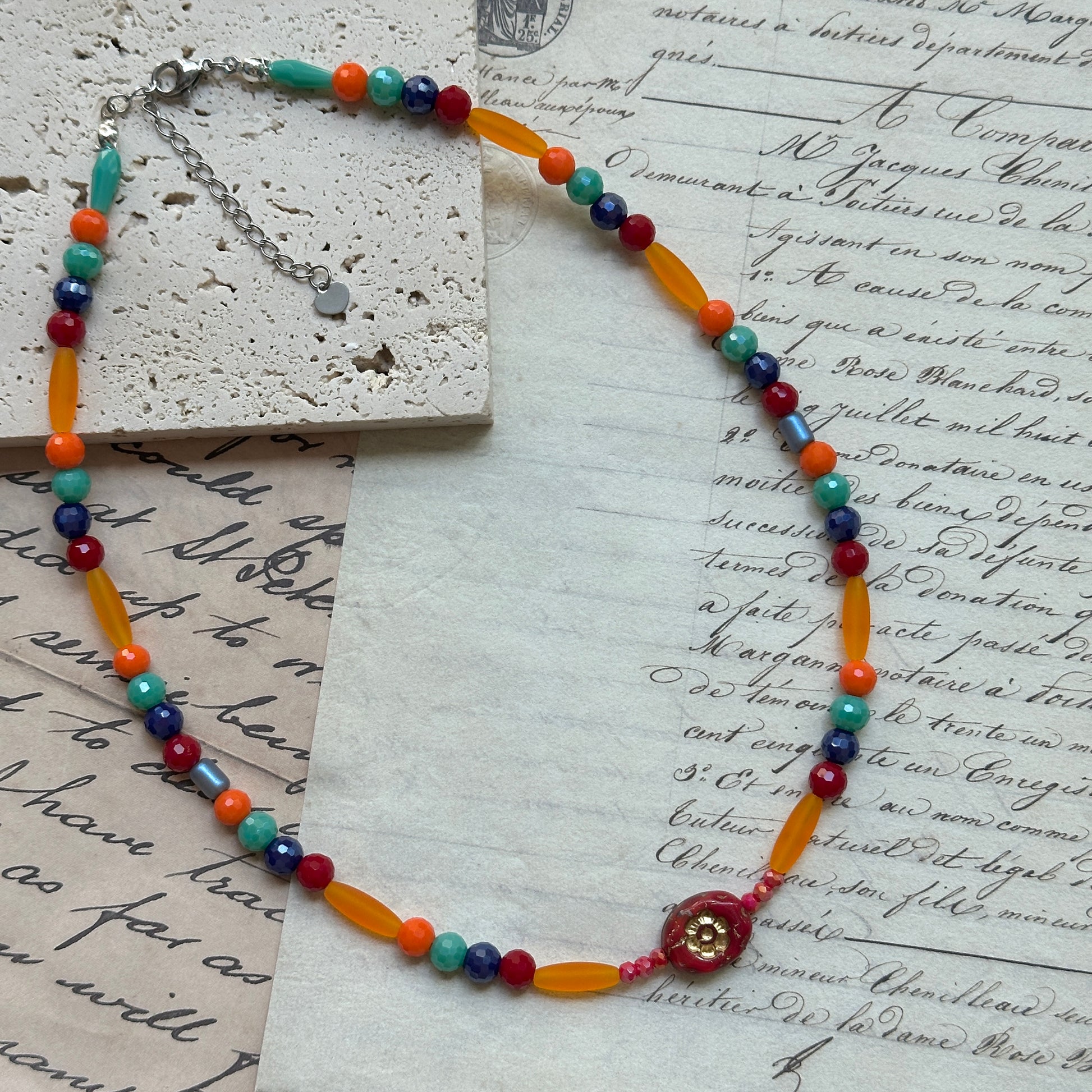 Inspired by the sun-kissed energy of a summer fiesta, the Sunburst Fiesta Necklace captures the joy of celebration and carefree moments. Its radiant palette symbolizes vitality, playfulness, and the warmth of sunlight—making it a statement piece for festivals, holidays, or simply brightening everyday style.