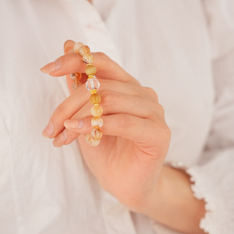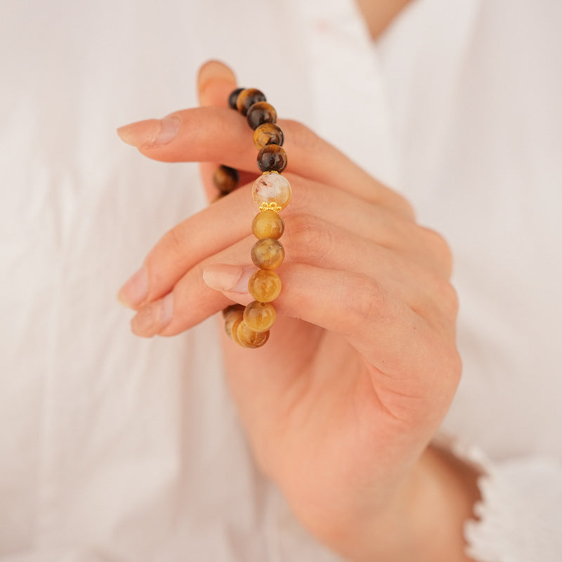 Radiant and easy to wear, the Sunset Harmony Crystal Bangle pairs sun-kissed yellow crystal with rich tiger-eye and gold-tone accents for a warm, luminous finish.