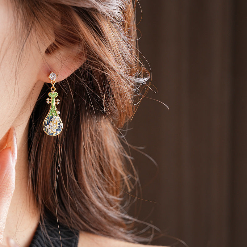 Inspired by antique lutes and Art Nouveau florals, these earrings blend verdant greens, midnight blues, and soft ivory to create a miniature secret garden that sways with every move.